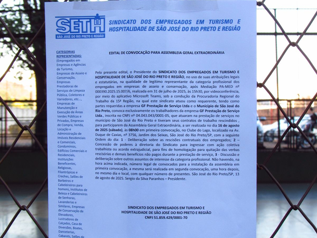 No sábado, 16 de agosto de 2025, o Sindicato dos Empregados em Turismo e Hospitalidade de São José do Rio Preto e Região (SETH) realizou assembleia com ex-funcionários da empresa GF Prestação de Serviço Ltda, dispensados em junho após o encerramento do contrato de prestação de serviços de limpeza, asseio e conservação com a Prefeitura de São José do Rio Preto.
