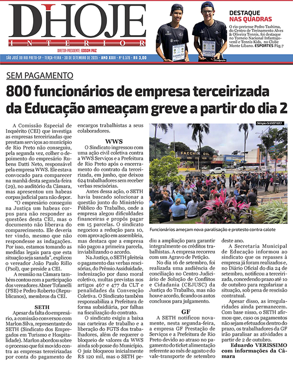 A SETH notificou novamente, nesta segunda-feira, a empresa GF Prestação de Serviços e a Prefeitura de Rio Preto devido ao atraso no pagamento do ticket alimentação referente ao mês de agosto e do vale-transporte de setembro deste ano.