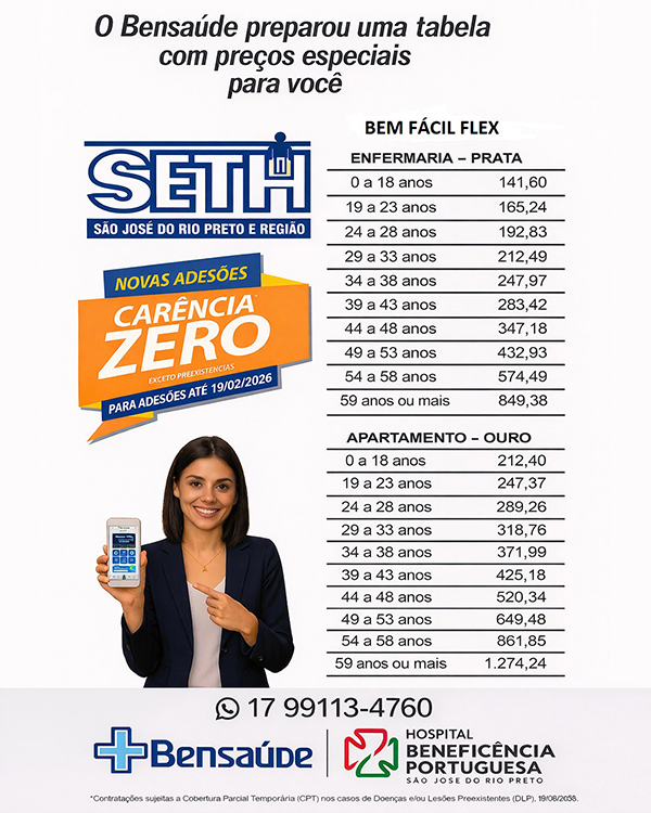 O Sindicato SETH oferece diversos benefícios para associados(as) e suas famílias, entre eles a parceria com o Bensaúde, o plano de saúde do Hospital Beneficência Portuguesa de São José do Rio Preto, referência em qualidade e atendimento na região.