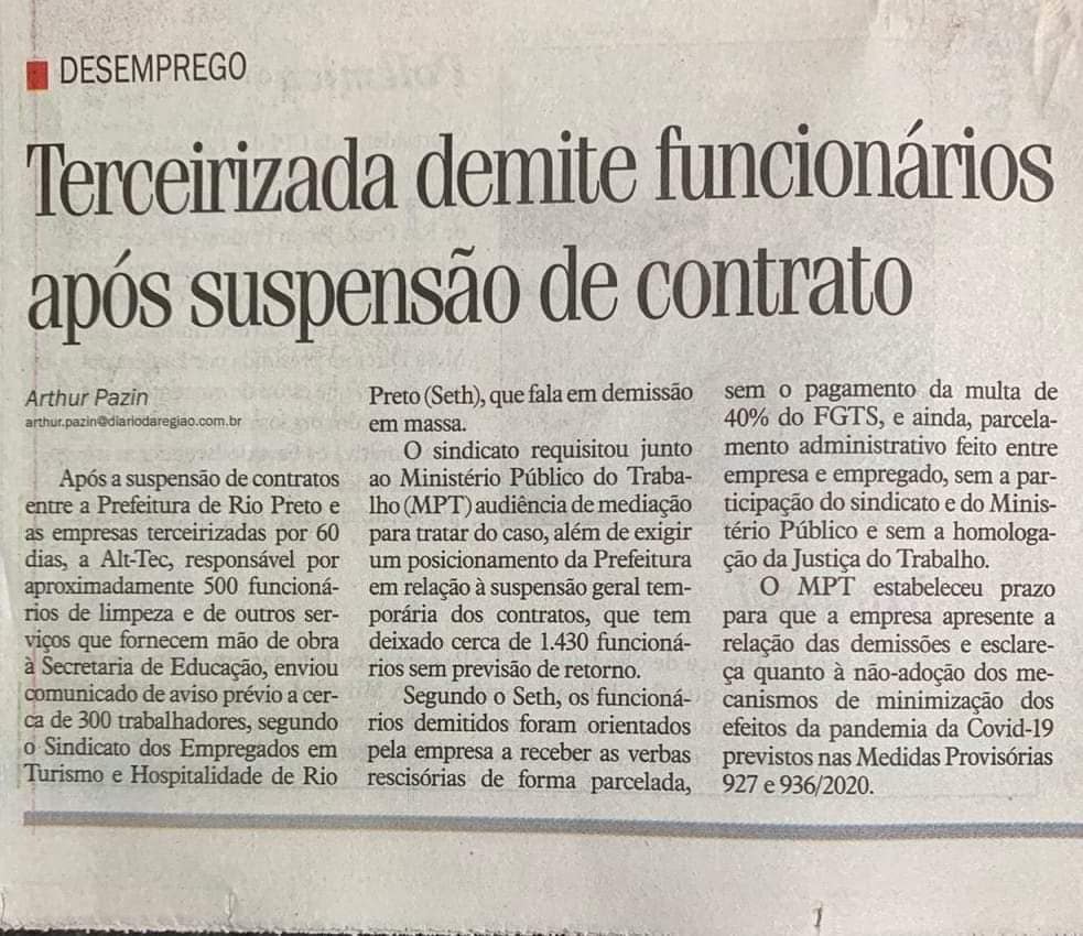 Na referida matéria, foi mencionado a atuação do SETH com o MPT - Ministério Público do Trabalho da 15º Região no município de São José do Rio Preto - SP, referente as demissões em massa ocorridas com os trabalhadores do setor de limpeza e conservação da empresa Alt tec Serviços Técnicos LTDA,após a suspensão dos contratos por 60 (sessenta) dias feita pela própria Prefeitura com as empresas que mantém contrato com a referida Secretaria Municipal de Educação, em razão deste triste momento que o mundo e todos nós brasileiros também estamos padecendo, pandemia, Coronavirus Covid - 19
