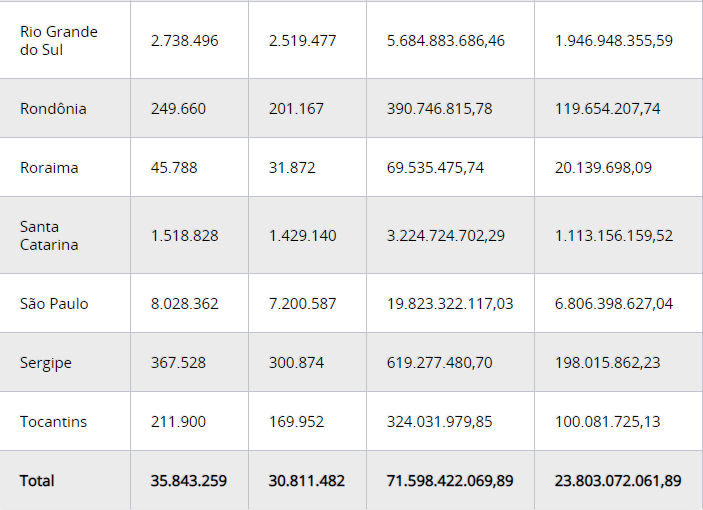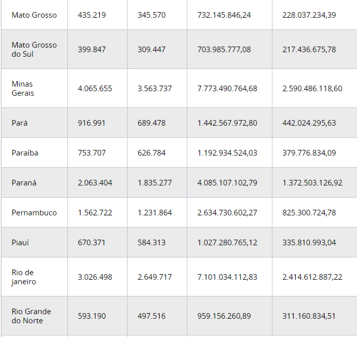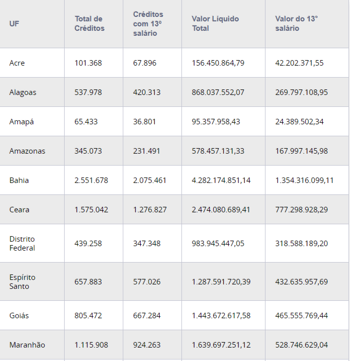 Abaixo, a tabela com os valores da segunda parcela do abono anual por unidade da federação: