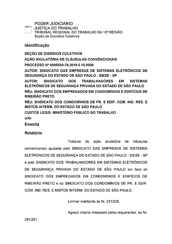 Baseado neste fundamento, o TRT da 15ª Região proferiu o acórdão, que pode ser acessado abaixo, que funciona como paradigma para solucionar casos análogos. É relevante observar que o SETH São José do Rio Preto e Região também possui em sua Convenção Coletiva de Trabalho 2019-2020 cláusula que veda a substituição de empregados de portaria por centrais terceirizadas de monitoramento de acesso ou "portarias virtuais" (cláusula 33ª), devendo ser respeitada pelos empregadores, sob pena de multa de 7 pisos salariais da categoria.