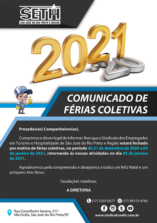 Cumprimos o dever legal de informar-lhes que o Sindicato dos Empregados em Turismo e Hospitalidade de São José do Rio Preto e Região estará fechado por motivo de férias coletivas, no período de 21 de dezembro de 2020 a 04 de janeiro de 2021, retornando às nossas atividades no dia 05 de janeiro de 2021.