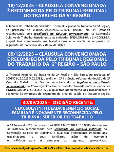 A jurisprudência das diversas instâncias da Justiça do Trabalho, especialmente por meio de decisões reiteradas do Tribunal Superior do Trabalho (TST), reafirma a plena validade jurídica das cláusulas previstas em Convenções Coletivas de Trabalho que instituem benefícios sociais geridos por empresas especializadas.